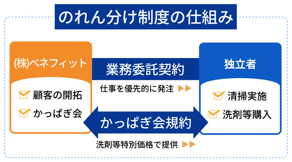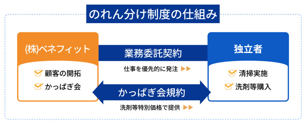 のれん分けでの独立なら、ベネフィットが主催する「かっぱぎ会」に入会でき、洗剤や機材レンタル等を会員価格で利用する事ができると共に、業務効率化のためのサポートプランも利用できる。